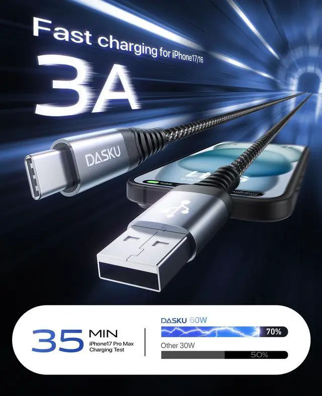USB to USB C cable perfect compatible with iPhone 17/16/15 series, Samsung Galaxy series, Google Pixel and more.