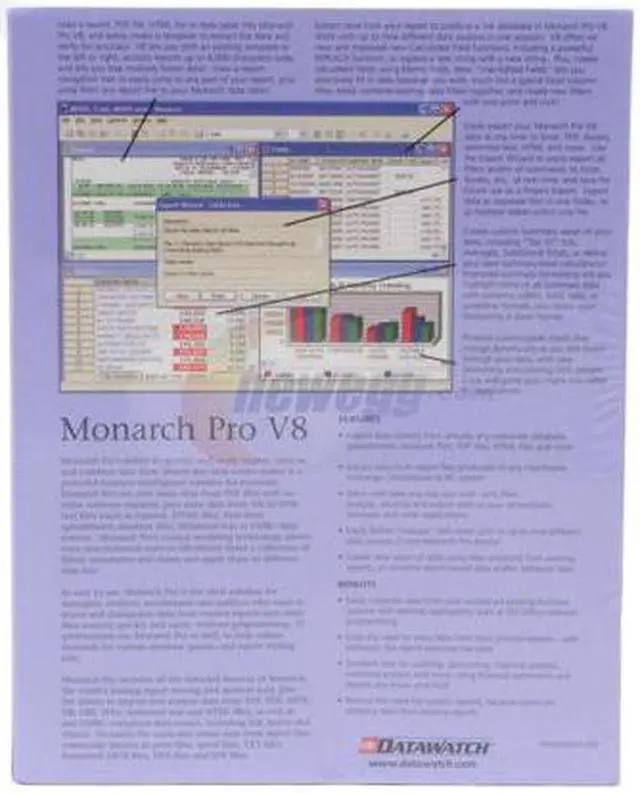 | Feature | Monarch Pro is a Windows-based business intelligence and reporting tool designed for easy use by everyone, not just a select group of "power users" with advanced technology skills. Unlike other BI or reporting tools, Monarch Pro easily "mines" data from existing text-based or PDF reports - an information source often overlooked by other BI tools. Monarch Pro also enables users to access and analyze data from database files, spreadsheets, ODBC sources, delimited text, and HTML files. Monarch Pro's unique modeling technology allows even non-technical users to effortlessly build a collection of filters, calculations, summaries and charts and apply them to different data sets, plus export data at anytime to Excel, Access, PDF, and more — all without programming and without help from the IT department. |