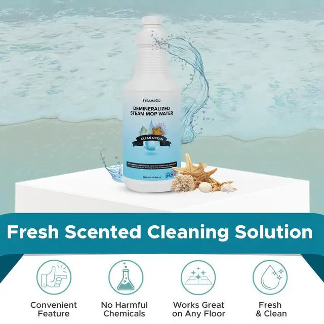 Experience the Steam&Go Demineralized Steam Mop Water, available in Eucalyptus, Tropical Bloom, Clean Ocean, Lavender, and Hotel California scents. It helps minimize minerals and impurities commonly found in tap water, preventing buildup inside your steam mop’s heating elements, pipes, and vents.