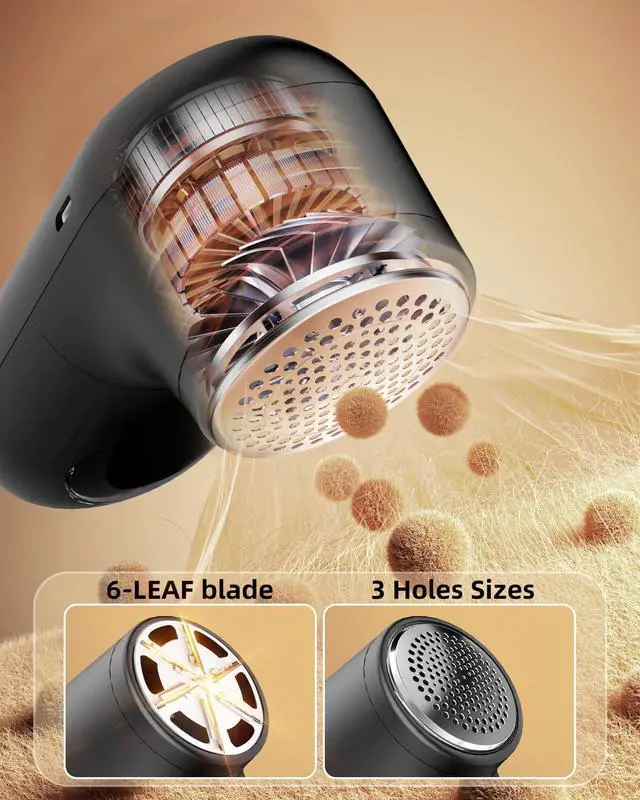 3 SHAVING HOLE & 6-LEAF BLADES Upgrade 3 shaving hole sizes and 6-leaf blades, our lint remover can increase work efficiency by 50%, remove fuzz pills without damaging the clothes and no hurt to the surface of the fabric. Which can meet the need of most fabric surfaces.