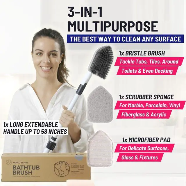 The Moku Home 3-in-1 extendable tub tile scrubber brush has three high-quality cleaning heads suitable for all surfaces