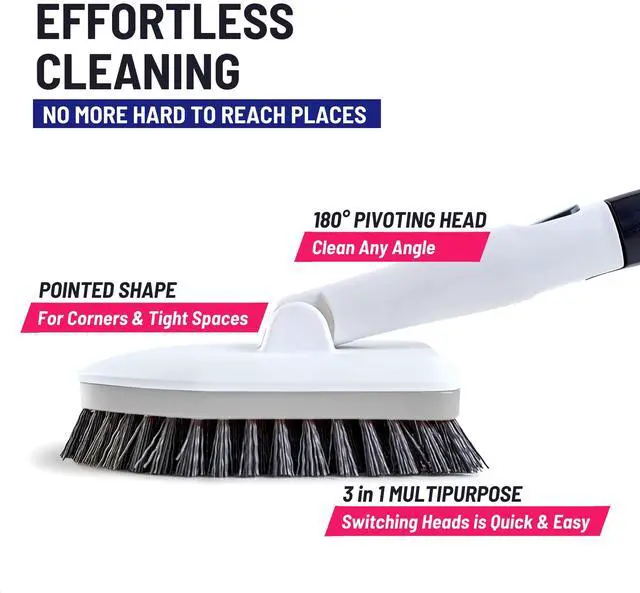 The shower cleaning brush with long handle has a pointed tip & 180-degree swivel, making it the perfect tool for tight spaces & hard-to-reach places