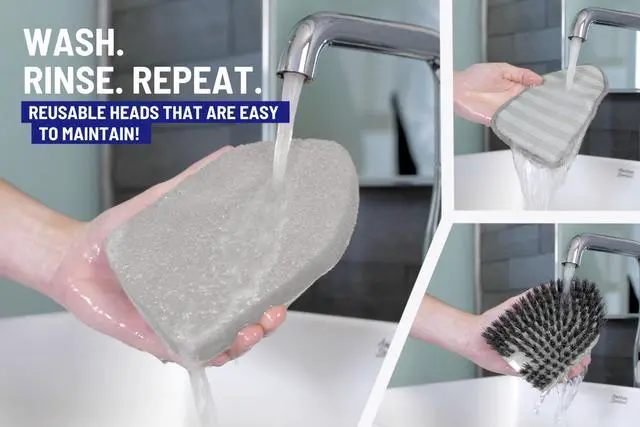 We officially recommend that you hand-wash the replacement heads, however the Scrubber Sponge and Microfiber Pad are safe to wash in the washing machine. All 3 replacement heads are safe to wash in the dishwasher