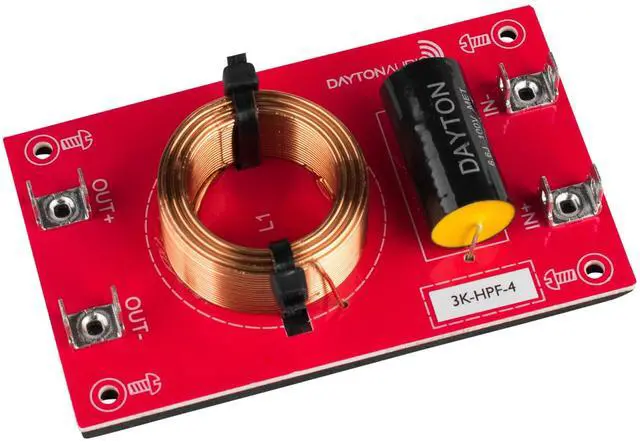 Quick OverviewThis 2nd order (i.e. 12 dB per octave) high pass Linkwitz-Riley filter from Dayton Audio passes frequencies above 3,000 Hz and can easily be combined with other filters in this series to create 2-way or even 3-way crossover networks. Designed for use with 4 ohm drivers. Product Highlights High quality poly capacitor in series with the driver High quality components are securely fastened to PCB Frequencies can be staggered or overlapped for desired response High quality red PC board with EVA backing to prevent shorts and vibration Dual 0.205" terminals at each connection point for easy parallel wiring Product Manuals / Spec Sheets / Downloads AddThis Sharing Buttons Share to FacebookFacebook Share to TwitterTwitter Share to MoreAddThis Product Description Dayton Audios premium inline passive filters make it easy to limit a drivers frequency response to a specific desired bandwidth. By using combinations of these filters you can create complete 2-way or 3-way crossovers. The components used in each of these are the same high quality you have come to expect from Dayton Audio. This 12dB/octave 3,000 Hz high pass filter can be combined with our 3,000 Hz low pass for a 2nd order Linkwitz-Riley crossover, which sums for flat transfer function across the crossover frequency. In addition, you can stagger or overlap filter frequencies to overcome peaks and dips in individual drivers frequency response to create crossovers that acoustically sum flat across the crossover point. Specifications: Type: High Pass Filter Frequency: 3,000 Hz Impedance: 4 ohms Dimensions: 100 mm x 60 mm Power handling: 250 watts Series capacitor value: 6.6 µF Parallel inductor value: 0.42 mH Product Details Model Number 3k-HPF-4 List Price $10.99 Unit of Measure Each UPC 848791004292 Warranty - Parts 5 Years Warranty - Labor 5 Years Product Shipping Weight (lbs.) 0.6 Product Weight -- Product Height -- Product Width -- Product Length -- Product Depth --