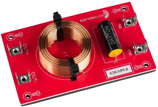 Quick OverviewThis 2nd order (i.e. 12 dB per octave) high pass Linkwitz-Riley filter from Dayton Audio passes frequencies above 4,500 Hz and can easily be combined with other filters in this series to create 2-way or even 3-way crossover networks. Designed for use with 8 ohm drivers. Product Highlights High quality poly capacitor in series with the driver High quality components are securely fastened to PCB Frequencies can be staggered or overlapped for desired response High quality red PC board with EVA backing to prevent shorts and vibration Dual 0.205" terminals at each connection point for easy parallel wiring Product Manuals / Spec Sheets / Downloads AddThis Sharing Buttons Share to FacebookFacebook Share to TwitterTwitter Share to MoreAddThis 1 Product Description Dayton Audios premium inline passive filters make it easy to limit a drivers frequency response to a specific desired bandwidth. By using combinations of these filters you can create complete 2-way or 3-way crossovers. The components used in each of these are the same high quality you have come to expect from Dayton Audio. This 12dB/octave 4,500 Hz high pass filter can be combined with our 4,500 Hz low pass for a 2nd order Linkwitz-Riley crossover, which sums for flat transfer function across the crossover frequency. In addition, you can stagger or overlap filter frequencies to overcome peaks and dips in individual drivers frequency response to create crossovers that acoustically sum flat across the crossover point. Specifications: Type: High Pass Filter Frequency: 4,500 Hz Impedance: 8 ohms Dimensions: 100 mm x 60 mm Power handling: 250 watts Series capacitor value: 2.2 µF Parallel inductor value: 0.57 mH Product Details Model Number 4.5k-HPF-8 List Price $10.99 Unit of Measure Each UPC 848791004438 Warranty - Parts 5 Years Warranty - Labor 5 Years Product Shipping Weight (lbs.) 0.5 Product Weight -- Product Height -- Product Width -- Product Length -- Product Depth --