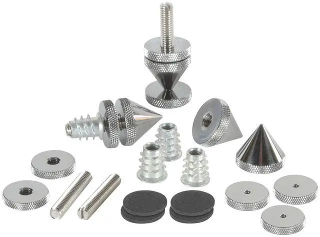 Quick OverviewRigidly coupling a loudspeaker enclosure to a floor by means of a "spiking" system dramatically improves clarity, stereo imaging, and bass response. Product Highlights Dramatically improves clarity, stereo imaging, and bass response Great results when used with subwoofer systems Solid brass construction with attractive plated finish Two-piece tip design for level adjustment Barbed inserts can be mounted from inside or outside the cabinet Product Manuals / Spec Sheets / Downloads Dayton Audio DSS5 Detailed DrawingsDayton Audio Speaker Spike Installation InstructionsBuying Options Buy NowBuy Internationally Product Description Rigidly coupling a loudspeaker enclosure to a floor by means of a "spiking" system dramatically improves clarity, stereo imaging, and bass response. This is especially apparent with subwoofer systems. These attractive spikes are precision machined from solid brass and then plated with a durable finish. Barbed insert nuts and 6 mm threaded studs are included for mounting in cabinets with walls up to 1" thick. Set includes four cone spikes, four floor discs, four barbed insert nuts, and four threaded studs. *Dimensions: 9/16" diameter, 1-5/16" high (including disc). Product Details Model Number DSS5-BC Color Black Chrome Unit of Measure Set UPC 844632083433 Warranty - Parts 5 Years Warranty - Labor 5 Years Product Shipping Weight (lbs.) 0.5 Product Weight -- Product Height -- Product Width -- Product Length -- Product Depth --