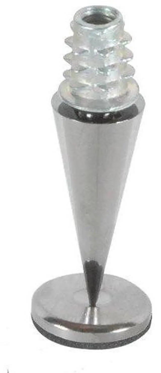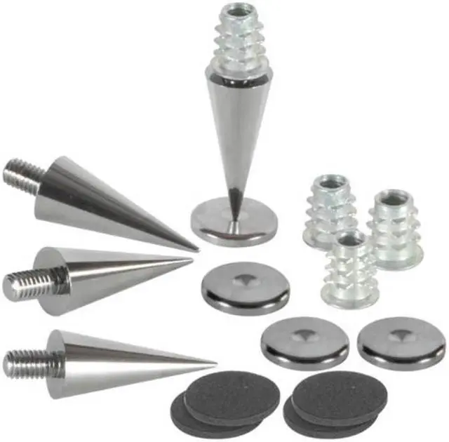 Overview Rigidly coupling a loudspeaker enclosure to a floor by means of a ''spiking'' system dramatically improves clarity, stereo imaging, and bass response. This is especially apparent with subwoofer systems. These attractive spikes are precision machined from solid brass and then plated with a durable finish. Barbed insert nuts and 6 mm threaded studs are included for mounting in cabinets with walls up to 1'' thick. Set includes four cone spikes, four floor discs, four barbed insert nuts, and four threaded studs. ; Dimensions: 9/16'' diameter, 1-5/16'' high (including disc).