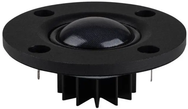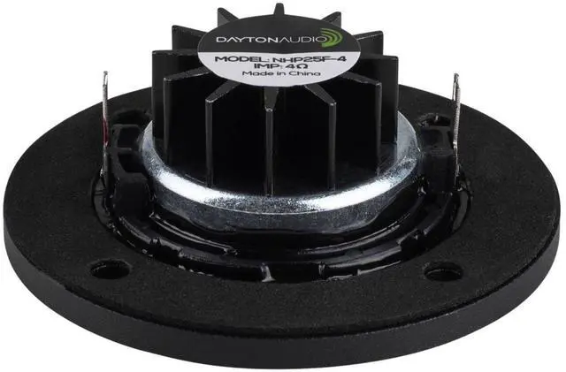 Quick Overview The Dayton Audio compact NHP25F-4 1" soft dome tweeter uses a high temperature neodymium motor, Ferrofluid cooling, and rear mounted heatsink for improved heat dissipation making this tweeter suitable for higher output systems and even professional line arrays. In addition, the flat response and high efficiency makes the NHP25F-4 an amazing value. Product Highlights Attached heatsink and ferrofluid cooling for increased power handling Over 95 dB efficient is perfect for use in higher output designs Compact cast aluminum faceplate minimizes center to center distance High temperature neodymium motor allows high output for extended periods Extremely smooth response makes for easy transition to midrange diver Product Manuals / Spec Sheets / Downloads Dayton Audio NHP25F-4 Specification Sheet Dayton Audio NHP25F-4 Data FilesBuying Options Buy NowBuy Internationally Product Description Dayton Audios versatile NHP25F-4 is a 1" titanium-dome tweeter that offers the performance of more expensive tweeters in a compact and stylish package. The small yet powerful high temperature neodymium motor with attached aluminum heatsink and Ferrofluid-filled magnetic gap reduces power compression and improves long-term power handling. In addition, the carefully designed titanium diaphragm provides accurate treble response up to 20 kHz, excellent off-axis dispersion, and superb sonic detail. The NHP25F-4 includes a 2.5" cast aluminum faceplate, however Dayton Audio does offer an optional 4.09" (104 mm) and 4.33" (110 mm) faceplate allowing this tweeter to be used as a drop in replace for many common sized tweeters. 104mm Cast Aluminum Face Plate for NHP Tweeters 110mm Cast Aluminum Face Plate for NHP Tweeters Product Details Speaker Series ND Series Model Number NHP25F-4 Color Black Unit of Measure Each UPC 848791004759 Warranty - Parts 5 Years Warranty - Labor 5 Years Product Shipping Weight (lbs.) 0.25 Speaker Type Tweeter Nominal Diameter 1" Power Handling (RMS) 40 watts Power Handling (max) 80 watts Continuous Program Power -- Impedance 4 ohms Sensitivity 95 dB 2.83V/1m Frequency Response 3,000 - 20,000 Hz Voice Coil Diameter 25.4 mm Magnet Weight -- DC Resistance (Re) 3.18 ohms Voice Coil Inductance (Le) 0.03 mH Resonant Frequency (Fs) 1689 Hz Mechanical Q (Qms) 3.75 Electromagnetic Q (Qes) 2.04 Total Q (Qts) 1.32 Diaphragm Mass Inc. Airload (Mms) -- Moving Mass Of Diaphragm (Mmd) -- Mechanical Compliance of Suspension (Cms) -- Surface Area Of Cone (Sd) -- Volume of Displacement (Vd) -- BL Product (BL) -- Compliance Equivalent Volume (Vas) -- Maximum Linear Excursion (Xmax) -- Drivers Mechanical Losses (Rms) -- Cone / Diaphragm Material Silk Entry / Exit Diameter -- Surround Material -- Voice Coil Wire Material Copper Voice Coil Former Aluminum Basket/Frame Material Aluminum Magnet Material Neodymium Overall Outside Diameter 63.75 mm Overall Depth 27.2 mm Baffle Cutout Diameter 40.1 mm Mounting Hole Diameter -- Bolt Circle Diameter -- Product Weight --