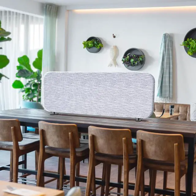 Functional desk screen designed to create privacy and define personal space at home workstations.