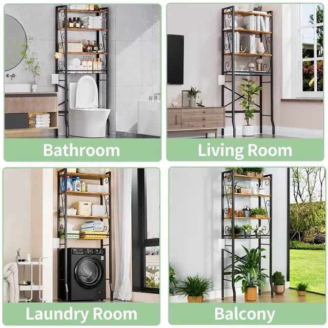 Over-The-Toilet Storage Rack 4-Tier,Bathroom Organizer Shelf Over Toilet,Adjustable Wooden Shelves and Basket,Freestanding Above Toilet Shelf,Space Saver for Rooms(Black Rack-Rustic Brown Shelves)