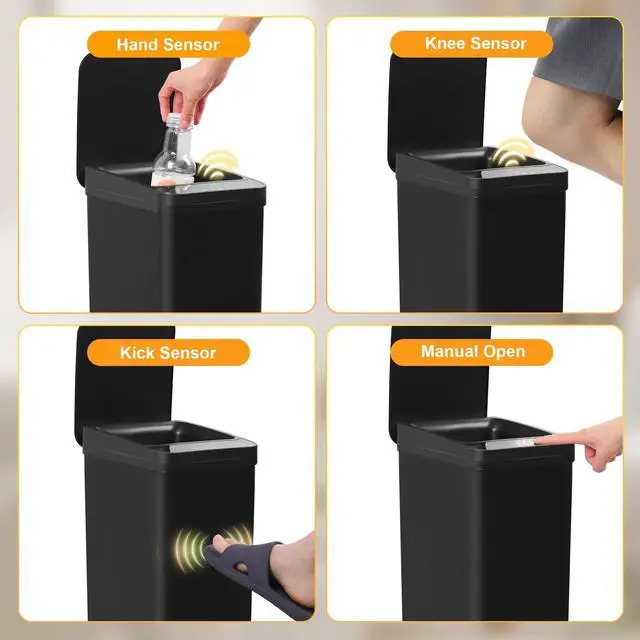 SMART SENSOR LID OPENING: The touchless trash can has four sensing methods: knee - bending, waving, button pressing, and foot kicking. Multiple sensing methods for opening the lid can better meet your needs