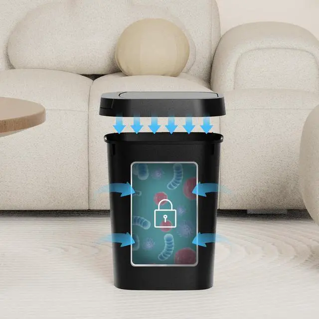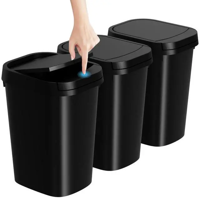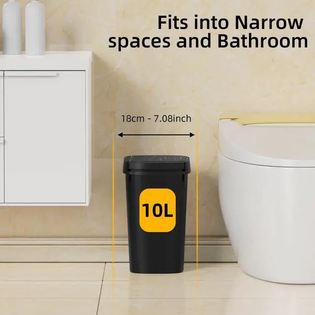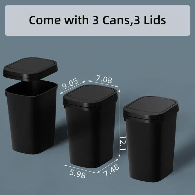 KSSKSS 3 Pack 2.6 Gallon Bathroom Small Trash Can with lid, Slim Garbage bin with Pop-Up Lid for Bedroom, Office, Kitchen, Craft Room, Fits Under Desk/Cabinet/Sink/ Why Choose KSSKSS Trash Can? Waste Disposal Made Simple: With a 2.6-gallon volume and slim profile, this bathroom trash can is spacious enough for bathroom waste yet slim enough to fit in narrow spaces, perfectly fitting most bathrooms. INCLUDES 60 DRAWSTRING BAGS: This 1.6-gallon trash can comes with 60 drawstring garbage bags, allowing you to use it immediately upon receiving the package. WHAT WE CAN SUPPORT: We can offer 1 year full-service manufacturer's promise. If the trash can you receive has any problems, please feel free to contact us and we'll provide you with satisfactory after-sales service. 1Perfect size for tight spaces: Slim profile of mini trash can allows small bedroom trash can to fit in narrow areas, while contemporary design of trash bin adds a touch of style to any room. 2VERSATILE AND PRACTICAL: Whether you need a small bin for your bathroom, bedroom, or office, our 2.6-gallon wastebasket is a perfect choice. 3Pop-up design lid: The small trash can is design with a pop-up design lid, just need simply tap the button to open or closed the lid. The press top lid can allows you to store it in plain sight. 4Stay Open: The lid can be held open for extended cleaning after being manually opened to 90°. 5STYLISH DESIGN: Our trash can's sleek and contemporary design adds a touch of style to any room. 6Efficient and Durable: Crafted from premium-grade ABS material, this small trash can with lid boasts high durability and resistance to wear and tear. Specifications: Color: Matt Black Material: ABS Plastic Product Size: 9.05"(L) x 7.08" (D)x 12.1"(H) Volume: 2.6 Gallons (10L) Product Weight: 3.8 lb (2.04 kg) Package Contents: Bathroom Trash Can x 3 Trash bags x 60 pcs