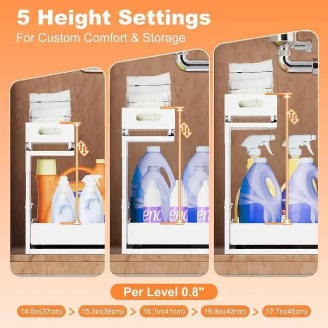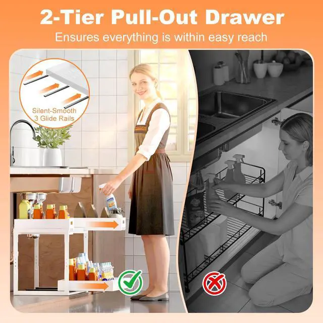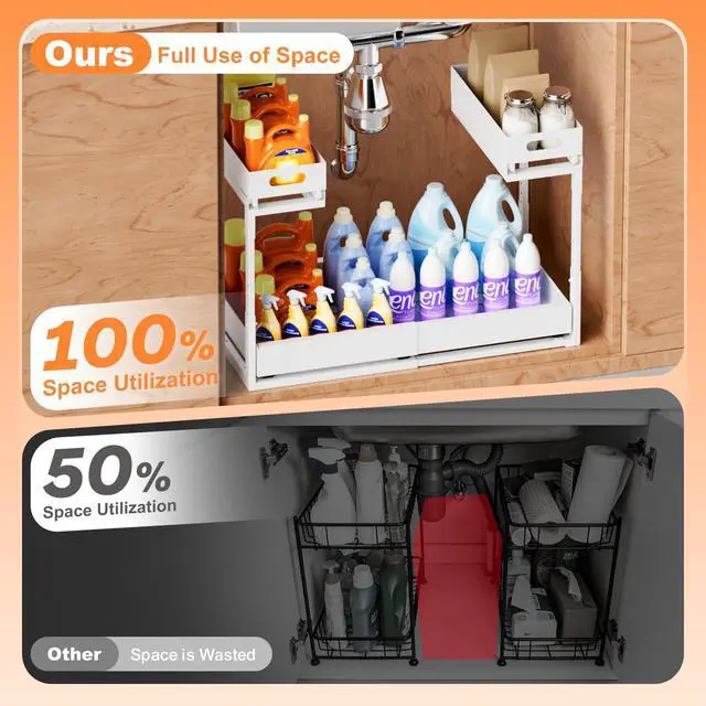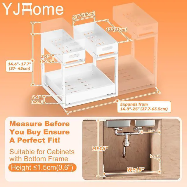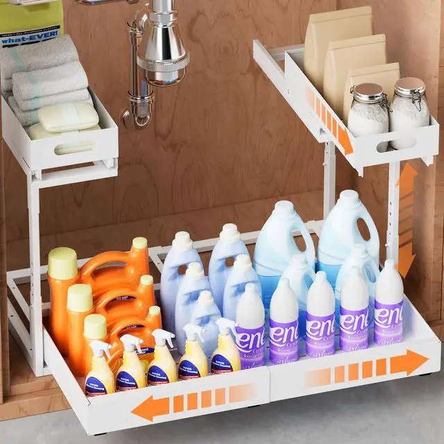 Tired of the chaos under your sink? Our Under Sink Organizer is the ultimate solution for maximizing space and bringing order to your kitchen or bathroom. Featuring an innovative slide-out design with smooth-gliding rails, this under cabinet organizer makes accessing your items a breeze. No more digging through dark corners! Customizable Width for a Perfect Fit One of the biggest challenges with under sink storage is the irregular space. Our organizer solves this! The adjustable width feature allows you to extend or retract the unit to perfectly fit your specific cabinet, whether it's a narrow under bathroom sink organizer or a spacious under kitchen sink organizer. This ensures a snug, secure, and stable fit every time. Smooth Pull-Out Convenience Say goodbye to lost items at the back. This under sink pull out organizer glides effortlessly on its sturdy rails, bringing all your cleaning supplies, toiletries, or kitchen essentials right to your fingertips. It's the perfect under sink organizers and storage solution for keeping everything visible and accessible. Durable & Versatile Storage Constructed from high-quality, heavy-duty materials, this undersink organizer is built to last. It's rust-resistant and easy to clean, making it ideal for use as a kitchen sink organizer or a bathroom under sink organizer. Organize spray bottles, soaps, sponges, and more with ease. Simple Assembly, Instant Order Transform your under the sink area in minutes. Our under cabinet storage rack is easy to assemble with clear instructions. Reclaim your space today with this must-have under sink storage organizer! What's in the Box? 2 x Under Sink Organizer Rack, 1 x Set of Installation Hardware, 1 x Instruction Manual.