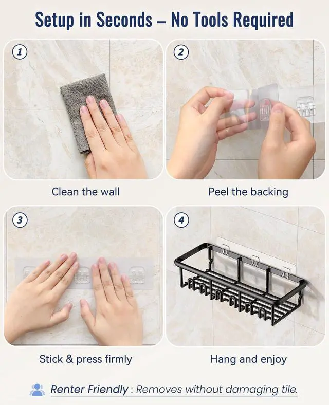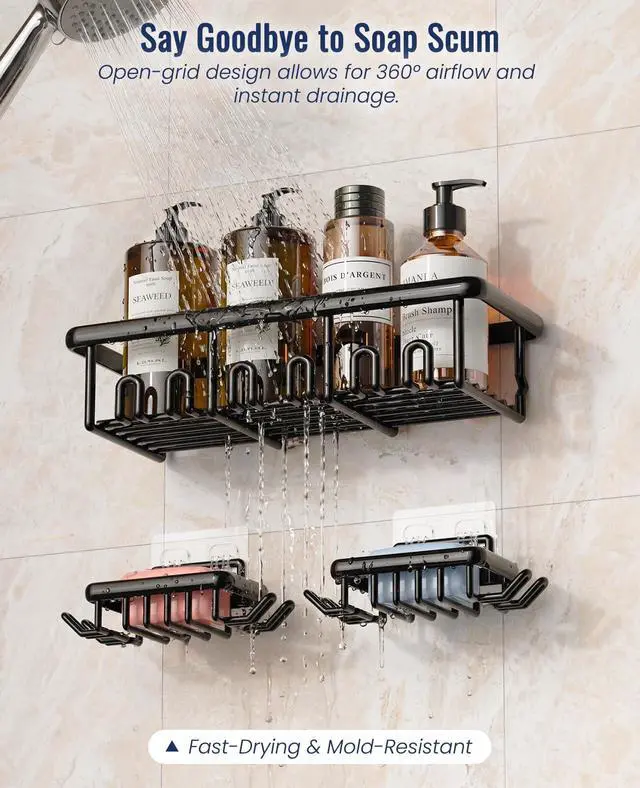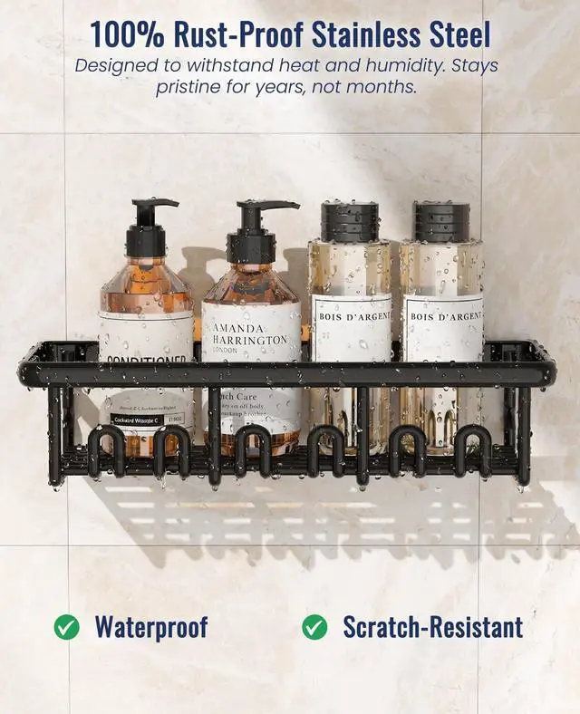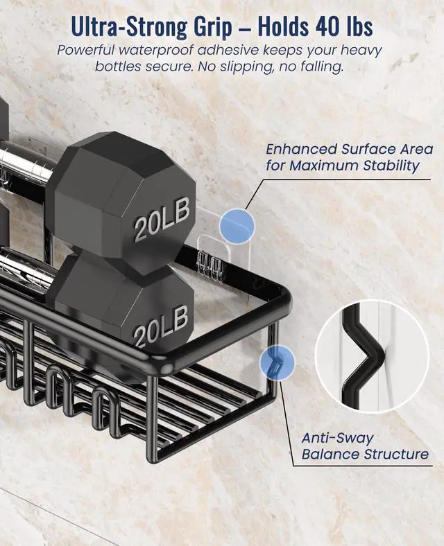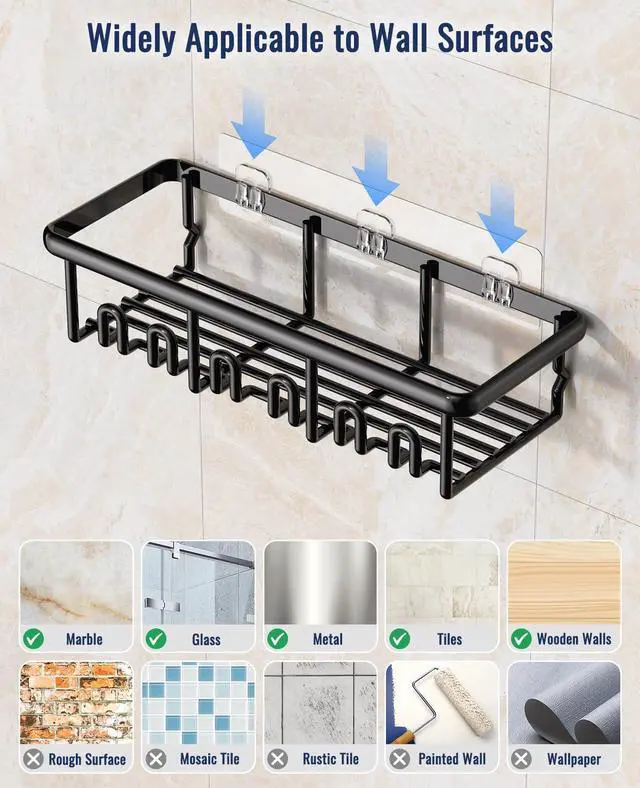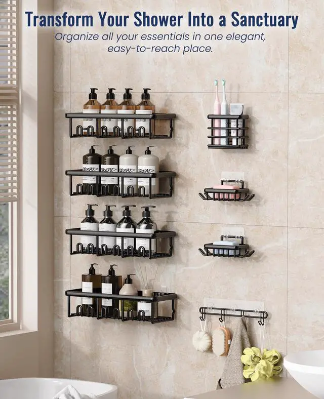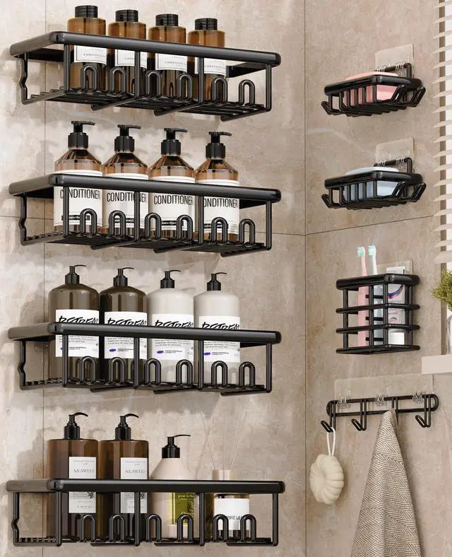 Zeawec 8 Pack Adhesive Rustproof Shower Shelves with Soap Dishes, Toothbrush Holder & Hooks, Large Capacity No-Drilling Shower Shelves Rack for Bathroom Organizers and Storage Accessories, Black