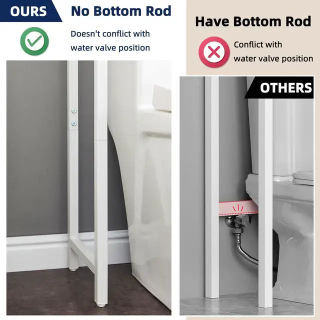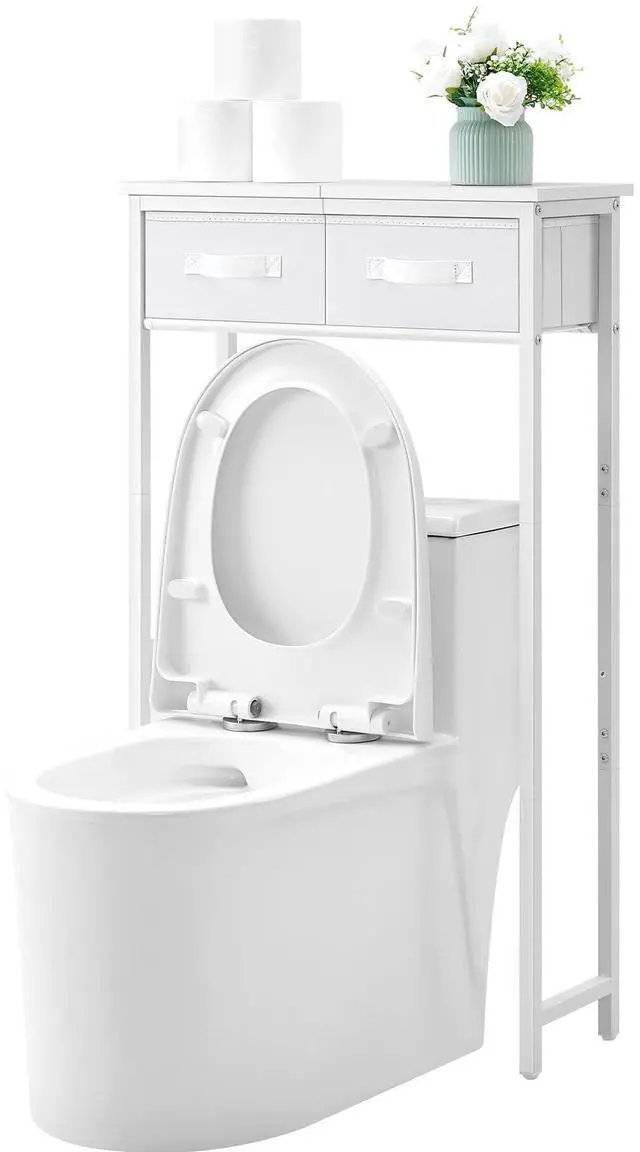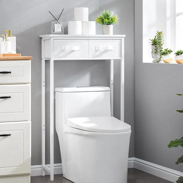 This over the toilet storage cabinet will add storage space to your bathroom, making the most of the space above the toilet without clashing with the floating shelf behind the toilet, making it suitable for small places. The 2-Tier over toilet bathroom organizer is made of high quality particleboard and thickened metal frame for a stable and sturdy structure that is durable, and the simple neutral lines fit any style of bathroom. The included adjustable feet and adhesive anti-tip fittings prevent the over the toilet shelf from swaying or tipping, adding stability while avoiding drilling holes that could cause damage to the wall. The 2 fabric drawers are designed to keep out dust and moisture for easy storage. The fabric drawers can hold toilet paper, towels and shower gel, as well as women's personal items, and organise small items to keep the bathroom tidy. We provide detailed installation instructions for each product package and each accessory is labelled. The clear and concise instructions and included tools make the installation process simple and straightforward. If you encounter any problems during installation or use, please feel free to contact us!