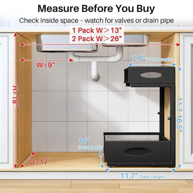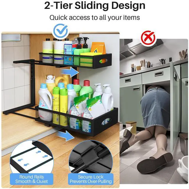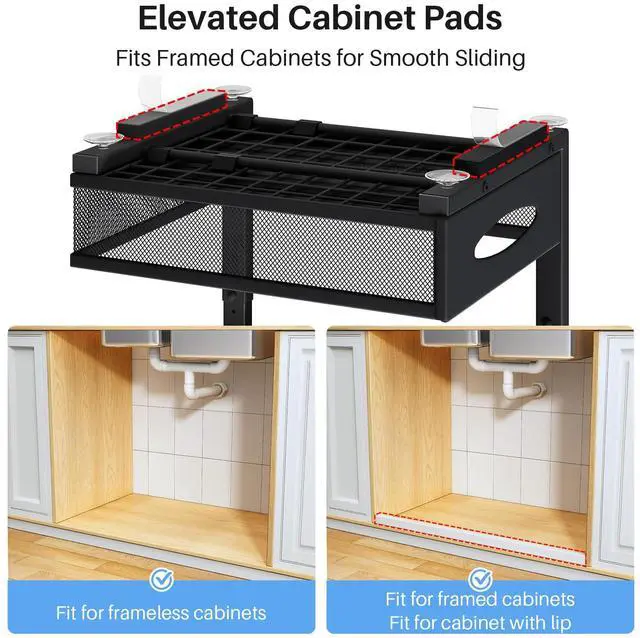 This 2-tier under sink organizer maximizes cabinet space with a large bottom basket (16" x 11") and a top basket (15.35" x 7.5"). Made of reinforced steel, it holds up to 50 lbs and features a rust-resistant finish. The 3" high mesh sides keep items upright and secure, while smooth-glide rails offer easy access. With adjustable height (11.6"16.5") and a cabinet shim pad, it's compatible with both framed and frameless cabinets. Easy to installthis organizer is perfect for kitchens, bathrooms, and pantry storage.