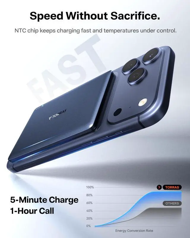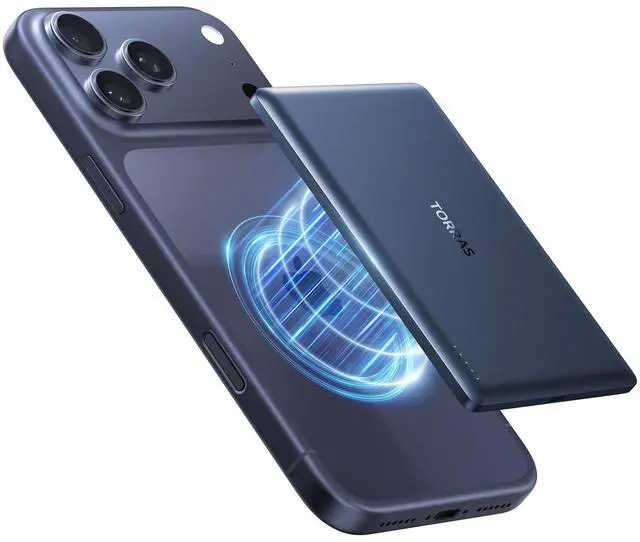 TORRAS MiniMag 5000mAh Magnetic Charger, the ultimate slim and durable portable power bank. Compatible with iphone 17 pro max/iphone 16 pro max /iPhone 15 Pro Max / iPhone 14 Pro Max / iPhone 13 / iPhone 12, AirPods Pro 1/2/3, Samsung Galaxy S25 Ultra / S25 / S25 Plus / S24 Ultra, iPad Pro / mini, and more. Featuring low-temperature safe magnetic wireless charging, 10W wired charging, and a low-current mode for Apple earphones. With its ultra-thin design, it fits seamlessly in your hand and offers a powerful 10N magnetic attraction. Experience fast, portable, and reliable charging wherever you go.
