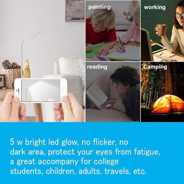 The bright desk lamp with 5 W bright led glow, 400 lumens at full brightness, rechargeable and energy saving led glow, no flicker, no dark area, protect your eyes from fatigue. a great accompany for reading, working, painting, crafting, sewing, or displaying an exhibition.