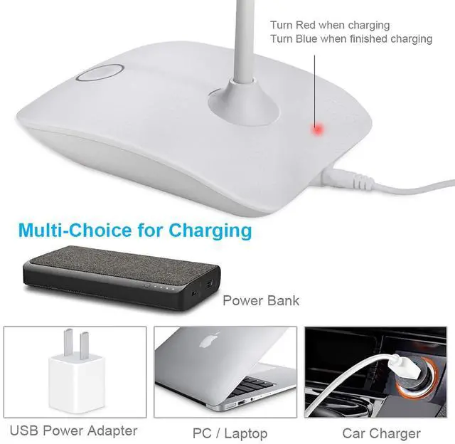 The USB rechargeable desk lamp is cordless portable design to take to anywhere freely, especially limited outlets and power outage happens,and last for 4-8 hours after fully charged (Brightness Duration: High 4-5 H, Mid 6-7 H, Low 7-8 H ),and can be used when charging by the computer or wall plug.