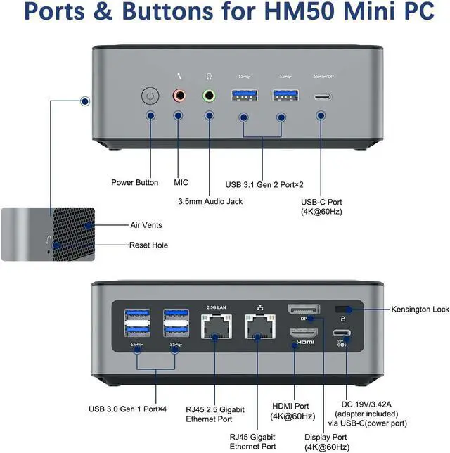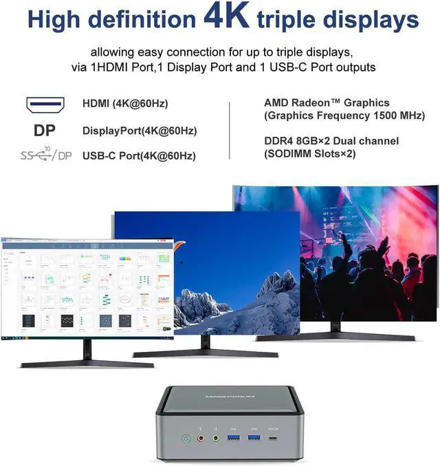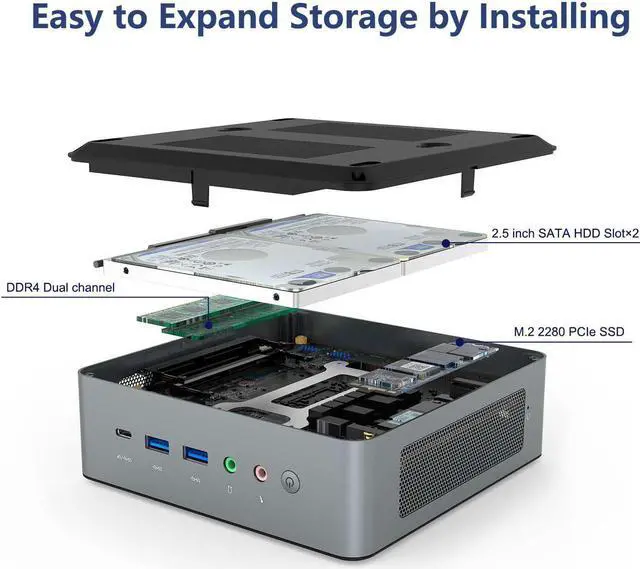 Specification:Processor: Ryzen 5 4500U , 6 Cores/6 Threads (Total L2 Cache 3MB , Total L3 Cache 8MB , Base Clock 2.3 GHz , up to 4.0 GHz)GPU: Radeon Graphics (Graphics Frequency 1500 MHz)Memory:DDR4 0GB×2 Dual channel (SODIMM Slots×2)Storage:M.2 2280 0GB PCIe SSDStorage Expansion:2.5 inch SATA HDD Slot×2 (SATA 3.0 6.0Gb/s)Wireless Connectivity:M.2 2230 WIFI Support ( WIFI6 AX200, BT5.1 pre-install)Ethernet:1000Mbps LAN 2500Mbps LANVideo Output: HDMI-compatible(4K@60Hz) DisplayPort(4K@60Hz) , USB-C Port(4K@60Hz, In Front)Audio Output:HDMI-compatible, DisplayPort, 3.5mm Audio Jack(Green)Peripherals Interface:RJ45 Gigabit Ethernet Port×1 , RJ45 2.5 Gigabit Ethernet Port×1, USB 3.0 Port×4(The Back), USB 3.1 Port×2(Gen2, In Front), Digital MIC×2 , Clear CMOS×1, COM PIN×1(Internal)Power:DC 19V/3.42A (adapter included), via USB-C(Power port)System:Windows 10 Pro