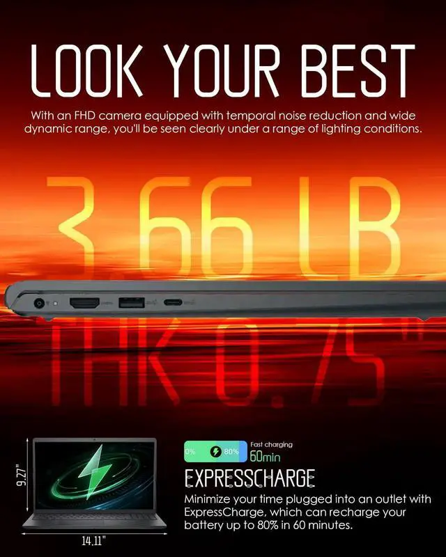 Adaptive thermals keep your PC running efficiently, whether at your desk or working from your lap. Your Inspiron 15 intelligently adjusts its power and thermals to keep running smoothly, using advanced algorithms and accelerometers. Plus, minimize your time plugged into an outlet with Express Charge, which can recharge your battery 80% in 60 minutes.