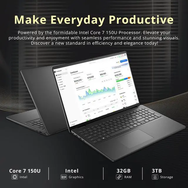 The Dell 16" FHD+ Touchscreen Business Laptop offers smooth multitasking with the Intel Core 7 150U Processor and clear visuals with Intel Graphics, enhancing productivity and professional workflow.