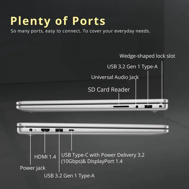 Windows 11 Home: 14.04''x9.82''x0.68'', 4.72 lbs. Port: 2x USB-A, 1x USB-C, 1 x HDMI 1.4, 1x Universal Audio jack, 1x SD card reader, 1x Power Jack. Wi-Fi 6E+Bluetooth 5.3. Platinum Silver. Bonus Docking Station Set: 1x 7-in-1 Docking Station w/ 256GB Storage, 1x 32GB MicroSD Card w/ Adapter, 1x Type-C Data Cable, 1x 3-in-1 Charging Cable, 1x Suede Cleaning Cloth.