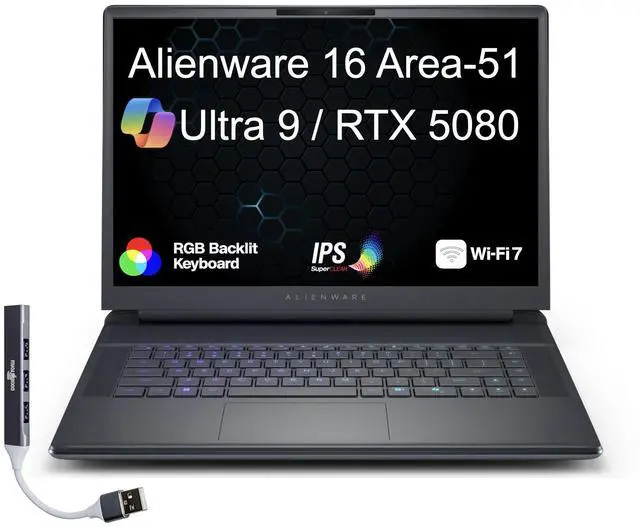 Model: Alienware 16 Area-51 AA16250Form/Style: StandardModel No: USEAA16250HBTSHMLTProcessor: Ultra 9- 275HX 2.70GHz Processor (upto 5.4GHz, 36MB Cache, 24-Cores, 24-Threads, 8 Performance-cores)Memory: 64GB DDR5 SO-DIMMGraphics: NVIDIA GeForce RTX 5080 16GB GDDR7 Dual (Integrated+Dedicated) Graphics, Storage: 4TB PCIe SSD (Solid State Drive)Operating System: Windows 11 Home-64Display: 16.0" IPS WQXGA (2560x1600) 240Hz 16:10 DisplayConnectivity: 802.11be, Bluetooth 5.4, Ports/Slots:, HDMI, 2 Thunderbolt 5, SD Card Reader, Headphone/Microphone Combo JackInput/Output: Webcam, Black, RGB KB Standard Keyboard, Battery: 360W PSU, 6-Cell 96 WHr BatteryOther Features, Color: Liquid TealWeight: 7.0lbProduct Dimensions (WxLxH): 11.4 IN x 14.4 IN x 1.25 IN1 Year Manufacturer warranty from Velztorm (Professionally upgraded by Velztorm)