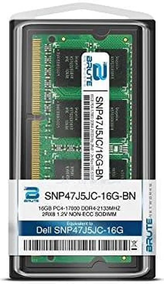 Dell Compatible SNP47J5JC/16G - 16GB PC4-17000 DDR4-2133MHz 2Rx8 1.2v Non-ECC SODIMM SNP47J5JC/16G-BN is a Dell compatible 16GB PC4-17000 DDR4-2133MHz 2Rx8 1.2v Non-ECC SODIMM, equivalent to Dell labeled PN#: SNP47J5JC/16G. Brute Networks modules are all major brand (Samsung, SK Hynix, or Micron). This module is guaranteed compatible with your computer, as well as guaranteed to maintain your factory warranty, since Brute Networks modules are from the same manufacturers Dell uses for their OEM branded modules.