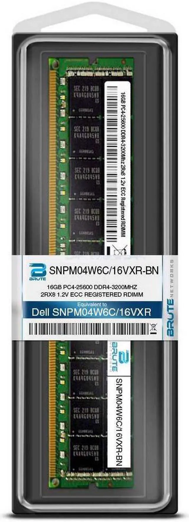 Brute Networks SNPM04W6C/16VXR-BN is an OEM compatible 16GB PC4-25600 DDR4-3200Mhz 2Rx8 1.2v ECC Registered RDIMM , equivalent to Dell labeled PN#: SNPM04W6C/16VXR
