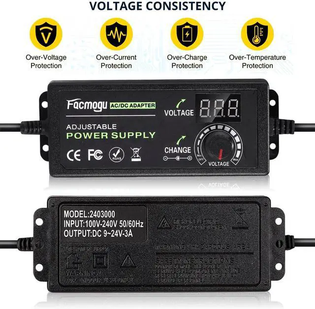 Facmogu AC/ DC Switching Power Adapter, Adjustable Power Supply 100-240V AC to 9-24V 3A 50-60hz DC Converter