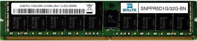 Dell Compatible SNPPR5D1G/32G - 32GB PC4-17000 DDR4-2133Mhz 4Rx4 1.2v ECC LRDIMM SNPPR5D1G/32G-BN is a Dell compatible 32GB PC4-17000 DDR4-2133Mhz 4Rx4 1.2v ECC LRDIMM, equivalent to Dell labeled PN#: SNPPR5D1G/32G. Brute Networks modules are all major brand (Samsung, SK Hynix, or Micron). This module is guaranteed compatible with your server, as well as guaranteed to maintain your factory warranty, since Brute Networks modules are from the same manufacturers Dell uses for their OEM branded modules.
