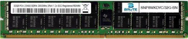SNP8WKDYC/32G-BN is a SNP8WKDYC/32G compatible 32GB PC4-23400 DDR4-2933Mhz 2Rx4 1.2v ECC Registered RDIMM, equivalent to Dell labeled PN#: SNP8WKDYC/32G. Brute Networks modules are all major brand (Samsung, SK Hynix, or Micron). This module is guaranteed compatible with your computer, as well as guaranteed to maintain your factory warranty, since Brute Networks modules are from the same manufacturer uses for their OEM branded modules.