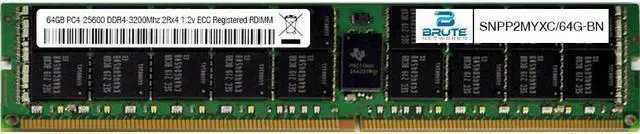 SNPP2MYXC/64G-BN is a SNPP2MYXC/64G compatible 64GB PC4-25600 DDR4-3200Mhz 2Rx4 1.2v ECC Registered RDIMM, equivalent to Dell labeled PN#: SNPP2MYXC/64G. Brute Networks modules are all major brand (Samsung, SK Hynix, or Micron). This module is guaranteed compatible with your computer, as well as guaranteed to maintain your factory warranty, since Brute Networks modules are from the same manufacturer uses for their OEM branded modules.