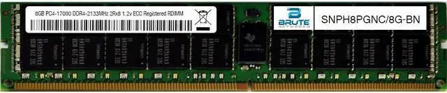 Dell Compatible SNPH8PGNC/8G - 8GB PC4-17000 DDR4-2133Mhz 2Rx8 1.2v Registered RDIMM SNPH8PGNC/8G-BN is a Dell compatible 8GB PC4-17000 DDR4-2133Mhz 2Rx8 1.2v Registered RDIMM, equivalent to Dell labeled PN#: SNPH8PGNC/8G. Brute Networks modules are all major brand (Samsung, SK Hynix, or Micron). This module is guaranteed compatible with your server, as well as guaranteed to maintain your factory warranty, since Brute Networks modules are from the same manufacturers Dell uses for their OEM branded modules.