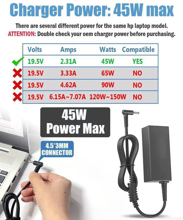 Our charger's power is 45W max. It's only compatible with the HP laptop which require 45W power. Please do not use this 45W charger to charge any laptop that requires 65W or higher power. ATTENTION:The charger's only compatible with 45W Hp laptop and not for 65W 90W 120W 135W 150W laptop.