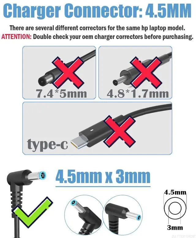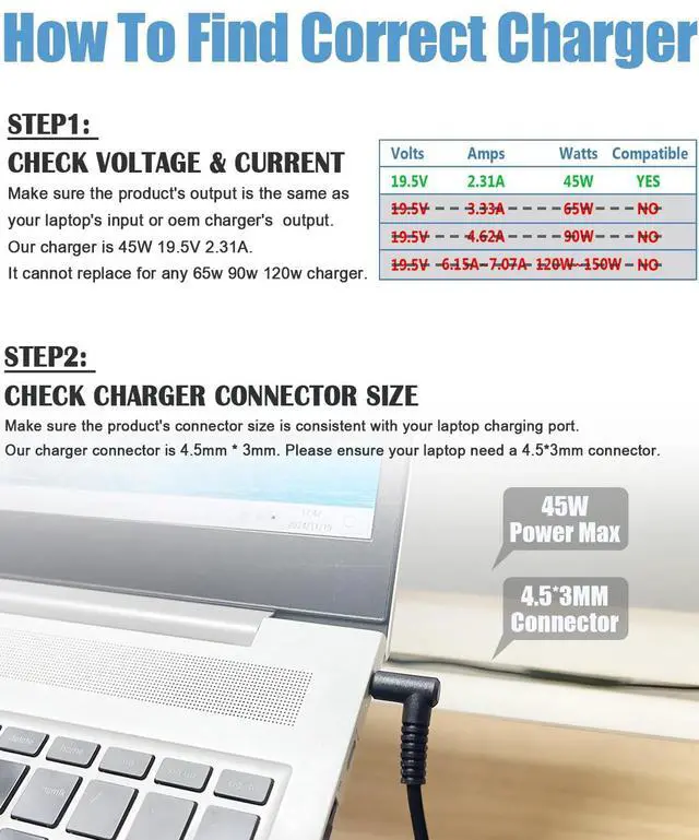 Attention: There are several different chargers for the same laptop model. The 45w charger cannot replace for 65w charger/ 90w charger/ 120w / 135W / 150W charger. Double check before purchasing.