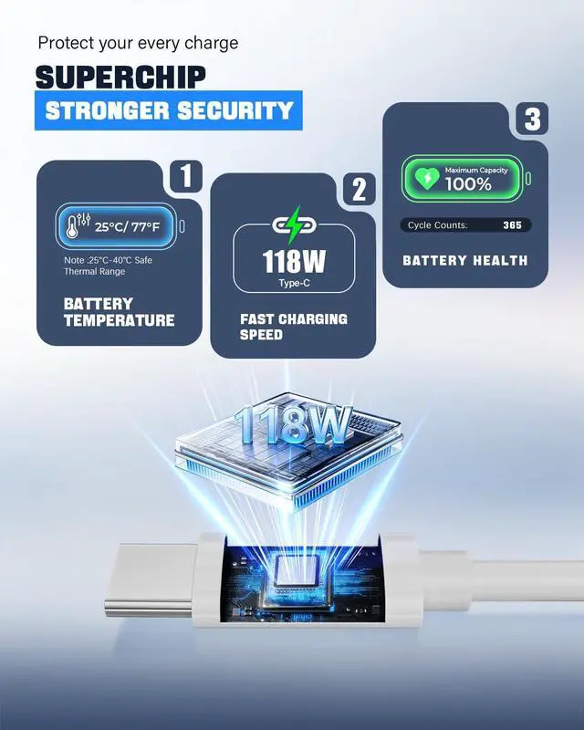 Included is a specialized 5A USB-C to C cable for full-speed 118W charging of your USB-C MacBook. It can charge a 15-inch MacBook Pro to 100% in approximately 1 hour 35 minutes. Compatible with USB-C PD chargers of 29W, 30W, 61W, 67W, 70W, 87W, and 96W.