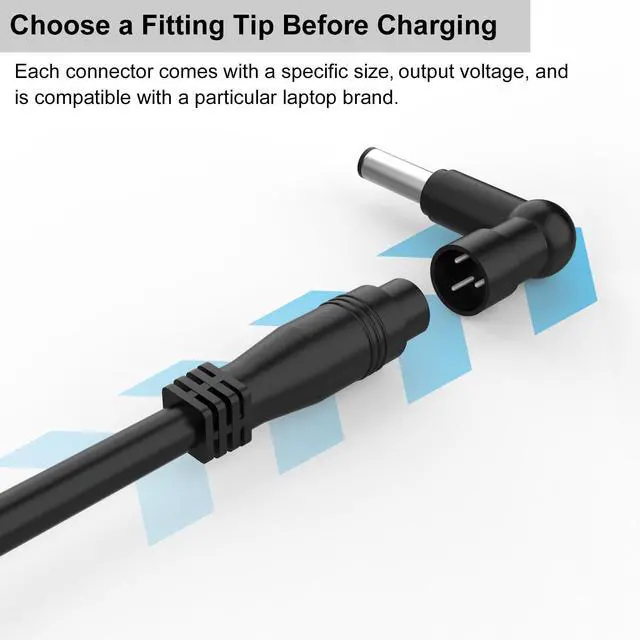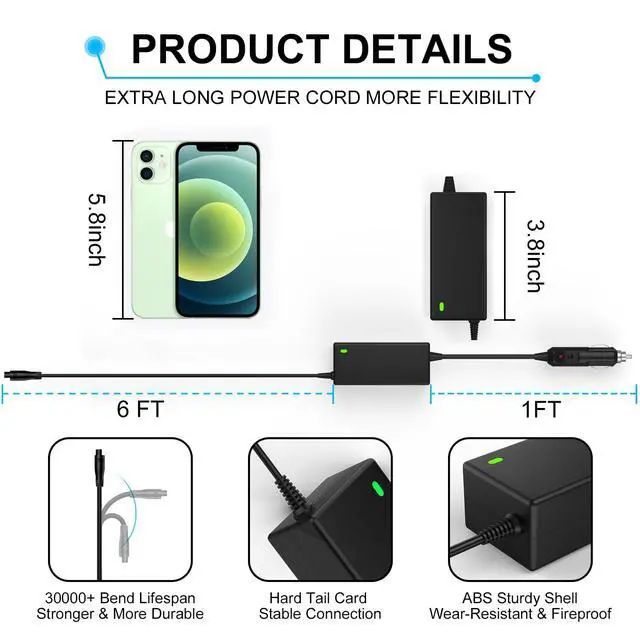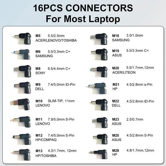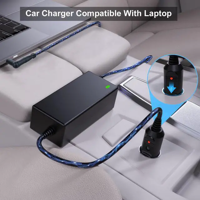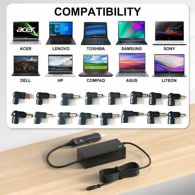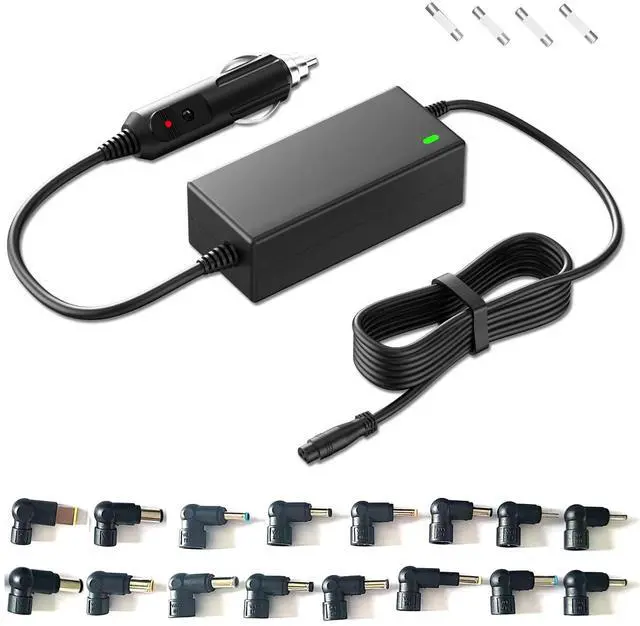 CAR LAPTOP CHARGER: Input: 12V-24V DC, Output: 18.5V, 19V, 19.5V, 20V, 45W/65W/90W, Connectors Size: 5.5*2.5mm, 5.5*3.3mm, 6.5*4.4mm, 7.4*5.0mm, USB Type, 7.9*5.0mm, 7.4*5.0mm, 4.0*1.7mm, 3.0*1.0mm, 4.0*1.2mm, 5.5*1.7mm, 4.5*3.0mm, 2.5*0.7mm, 4.8/1.7mm. PLEASE CONFIRM THE SPECIFICATIONS OF YOUR POWER ADAPTER BEFORE ORDERING