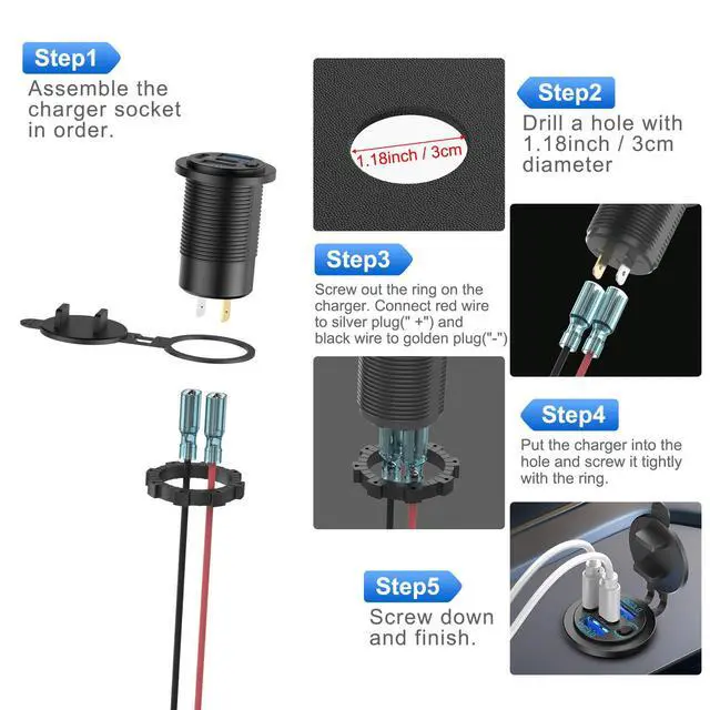 Approx. 2.44in depth space is required to install this product. DIY installation is required, red wire connects to “+”, black wire connects to “-”, see installation steps for details.