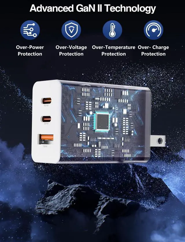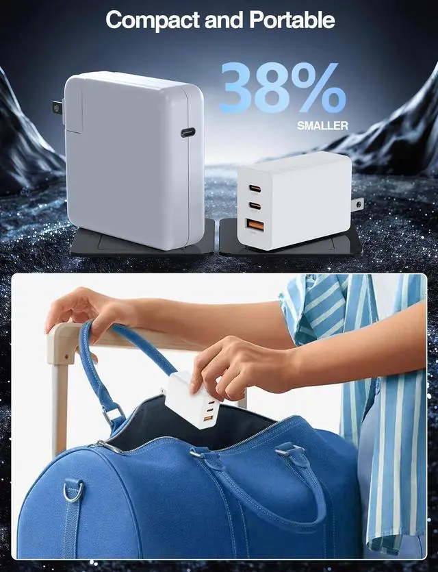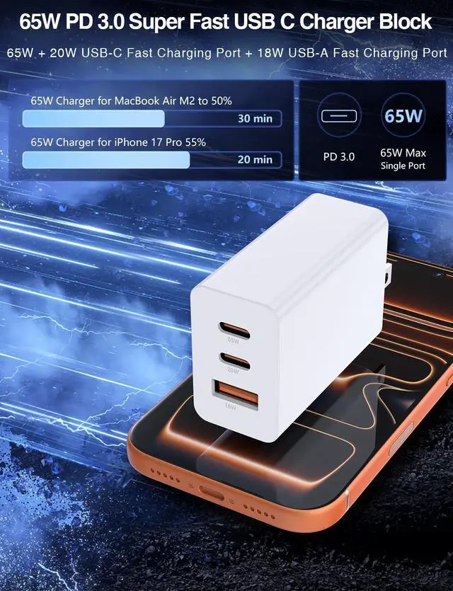The size of this charger is almost the same as the 45W charger block. The 3-port portable charging block is compact and lightweight for breakthrough performance. It can withstand bumps, drops and falls and is durable. It is easy to carry around and ideal for home, office and on the go.