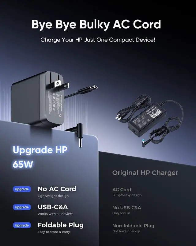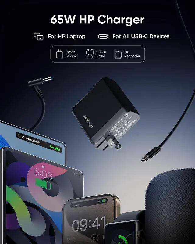 2-in-1 Charging Flexibility: This HP laptop charger features a smart convertible design for ultimate convenience. Attach the included 4.5mm adapter cable to charge your HP laptop at full 65W power. Detach it to use the built-in USB-C port for charging phones or tablets. No more carrying multiple chargers or dealing with messy cables.