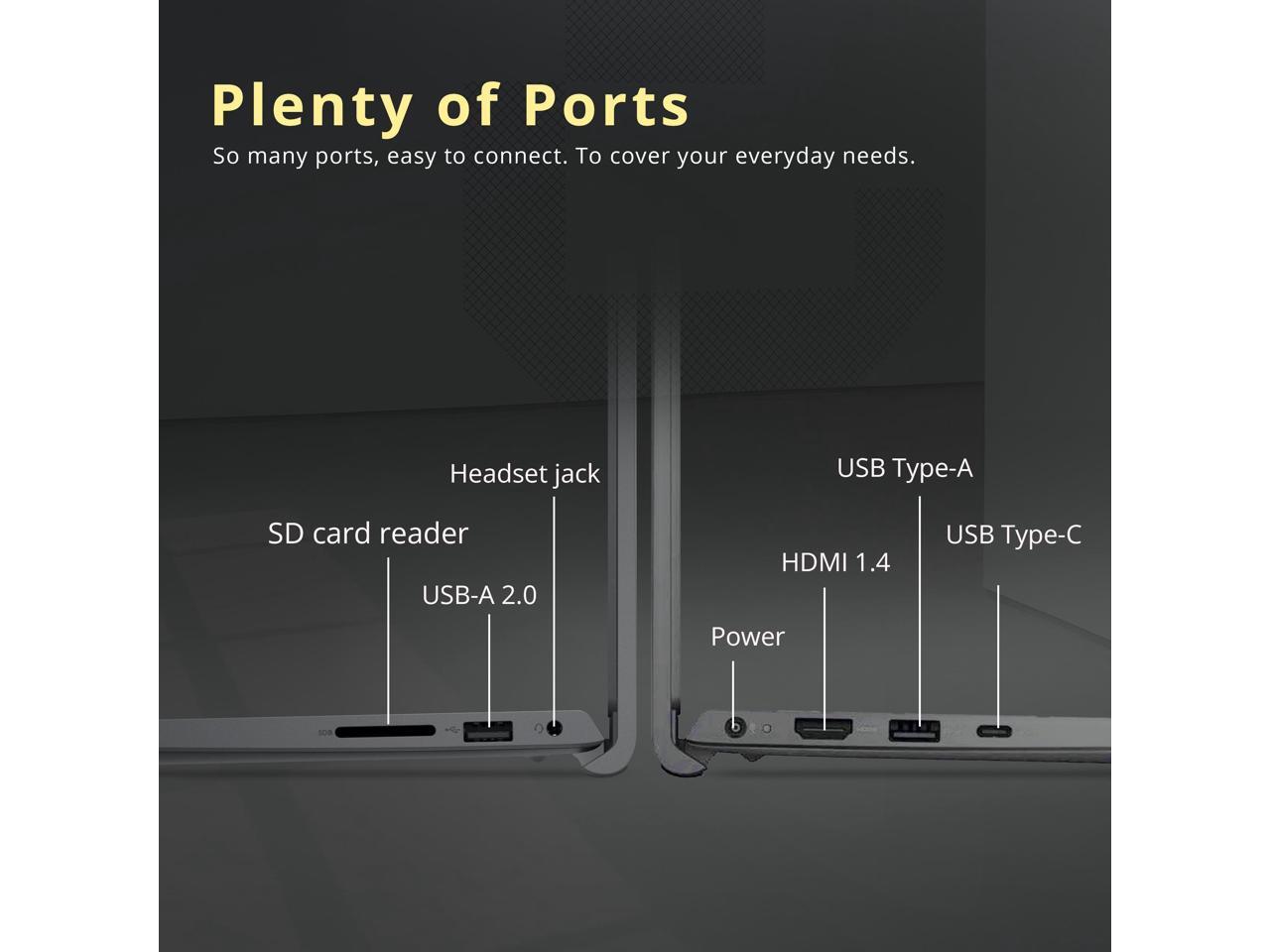 - Ports and Accessories: 1x USB 3.2 Gen 1 Type-A, 1x USB 3.2 Gen 1 Type-C, 1x USB 2.0, 1x Headset Jack , 1x HDMI 1.4, 1x SD Card Reader. Wi-Fi 6 + Bluetooth.