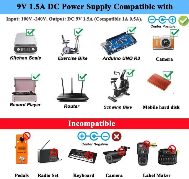 - Safety first! This adapter uses a Center Positive barrel plug. Always confirm your device requires a center positive plug before connecting. IMPORTANT: It is NOT compatible with devices requiring a center negative plug, such as certain Casio Keyboards and Zoom Guitar Pedals.