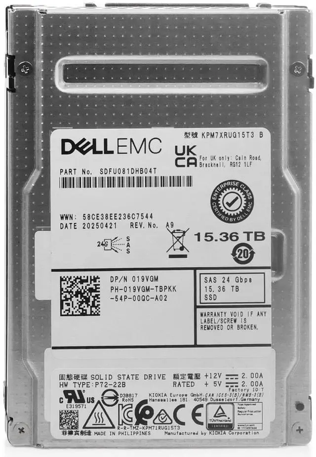 Dell EMC 019VGM KPM7XRUG15T3 15.36TB SAS-4 24Gb/s 3D TLC 1 DWPD 2.5in Enterprise SSD
