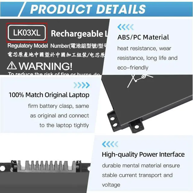| Compatible Part Numbers: | LK03XL LKO3XL L09281-855 916814-855 LK03048XL LK03055XL 916368-421 916368-541 HSTNN-LB7U HSTNN-LB8J HSTNN-UB71 HSTNN-UB7I L08855-856 L08934-1B1 L08934-2C1 L09049-1B1 L09280-855 L09911-141 L09911-421 TPN-W127 TPN-W128 TPN-I129 |