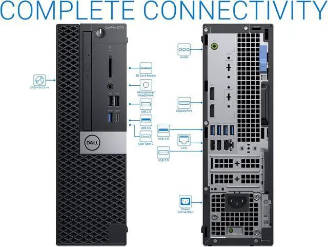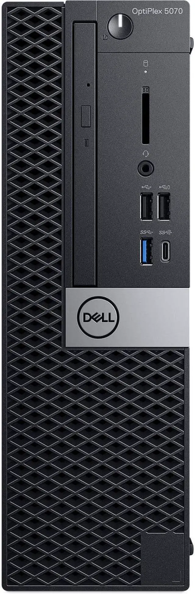 GENERAL INFORMATIONBrand: DellSeries: OptiPlexModel: 5070Form Factor: Small Form DesktopOperating System: Windows 10 ProPROCESSORProcessor Brand: IntelProcessor Type: Core i7-9700Number of Cores: 8Base Frequency: 3.0GHzTurbo Frequency: 4.7GHzSmartCache: 12MBMEMORYMemory Capacity: 8GBMemory Type: DDR4Memory Form Factor: DIMMMemory Speed: 2400Max Supported Memory: 64 GBSTORAGEDrive Capacity: 1TBDrive Type: NVMe SSD (PCIe)VIDEOIntegrated Graphics: Intel UHD Graphics 630AUDIOAudio Tech: HD AudioMULTIMEDIA DRIVESOptical Drive: DVD-WriterPORTS & FEATURESVideo Ports: 2x DisplayPortAudio Ports: Front: 1 x Headphone/Microphone Combo Jack. Rear: 1x Audio-OutUSB Ports: Front: 2x USB 2.0, 1x USB 3.1 Gen 1, 1x USB-C 3.1 Gen 1. Rear: 4x USB 3.1 Gen 1, 2x USB 2.0Security Slot: YesKeyboard & Mouse: WiredCOMMUNICATIONSLAN: Gigabit EthernetWi-Fi: Wi-Fi 5 (802.11ac)Bluetooth: Bluetooth 4.0POWERAC Adapter: 200WPHYSICAL SPECIFICATIONSLength: 11.5 in.Width: 3.7 in.Height: 11.4 in.Weight: 11.57 lbsColor: Black/Silver
