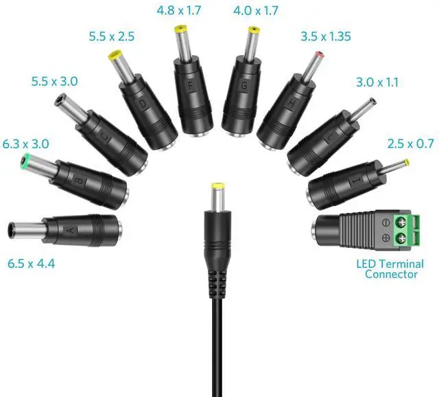 5.5*2.5mm, 5.5*2.1mm, 4.0*1.7mm, 4.8*1.7mm,3.5*1.35mm, 3.0*1.1mm, 2.5*0.7mm, 5.5*3.0mm, 6.3*3.0mm, 6.5*4.4mm,LED terminal connector.