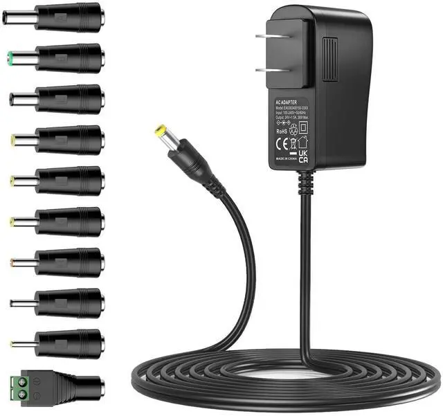Overview-- AC 100V-240V 50/60Hz Input, 24V dc 0-1000ma 24Watt Output, 5 Ft (1.5m) Power Cable / 2.1mm * 5.5mm Center Positive Barrel Plug /in order to meet your device's more requirements, it contains 10 different sizes of interchangeable plugs.
