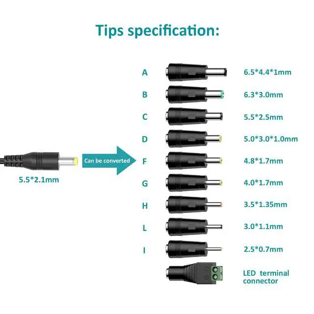 10 DC output jack size-- A: 6.5*4.4mm*1mm, B: 6.3*3.0mm, C: 5.5*2.5mm, D: 5.0*3.0*1.0mm, F: 4.8*1.7mm, G: 4.0*1.7mm, H: 3.5*1.35mm, L: 3.0*1.1mm, I: 2.5*0.7mm, LED terminal connector. Please check if the DC terminal size of your device matches one of them.